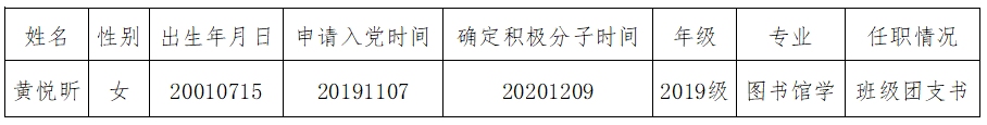 经支部委员会研究,党总支会议审议,报上级党委备案同意,将黄悦昕同志列为发展对象,拟定发展时间为2022年11月。根据发展党员工作有关要求,现将其有关情况公示如下: